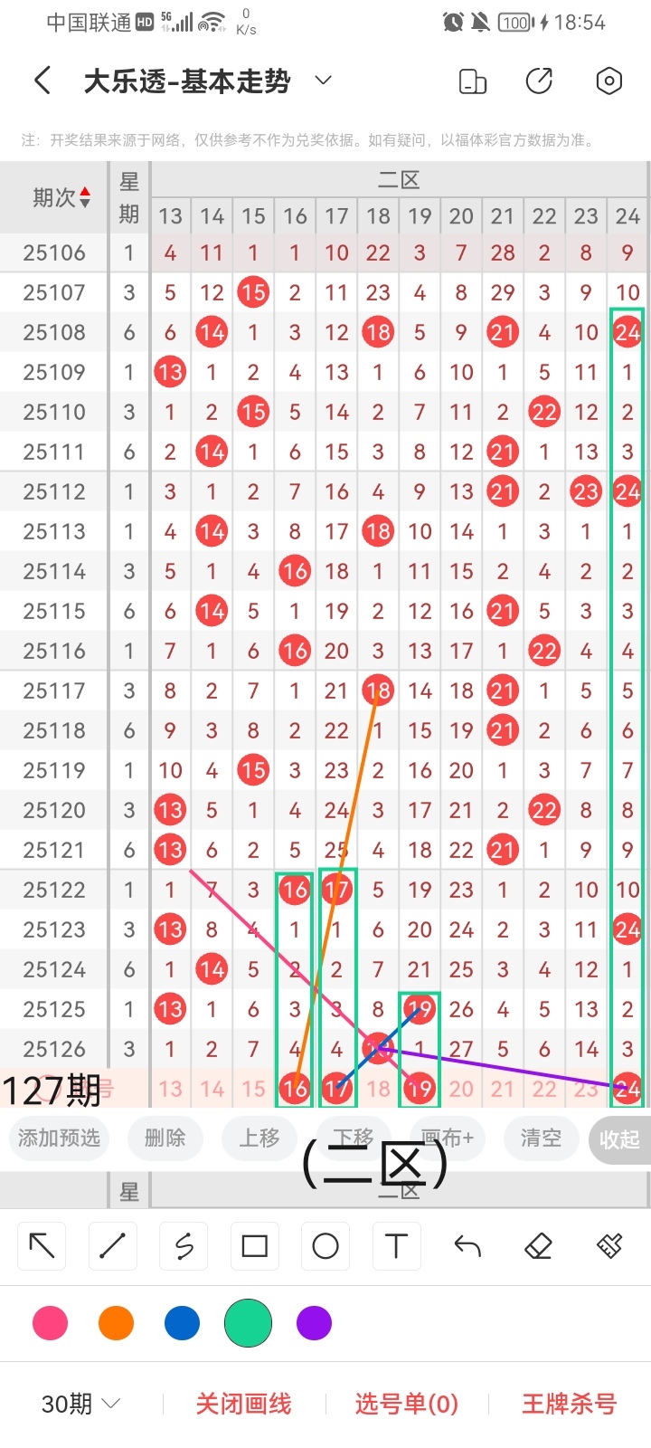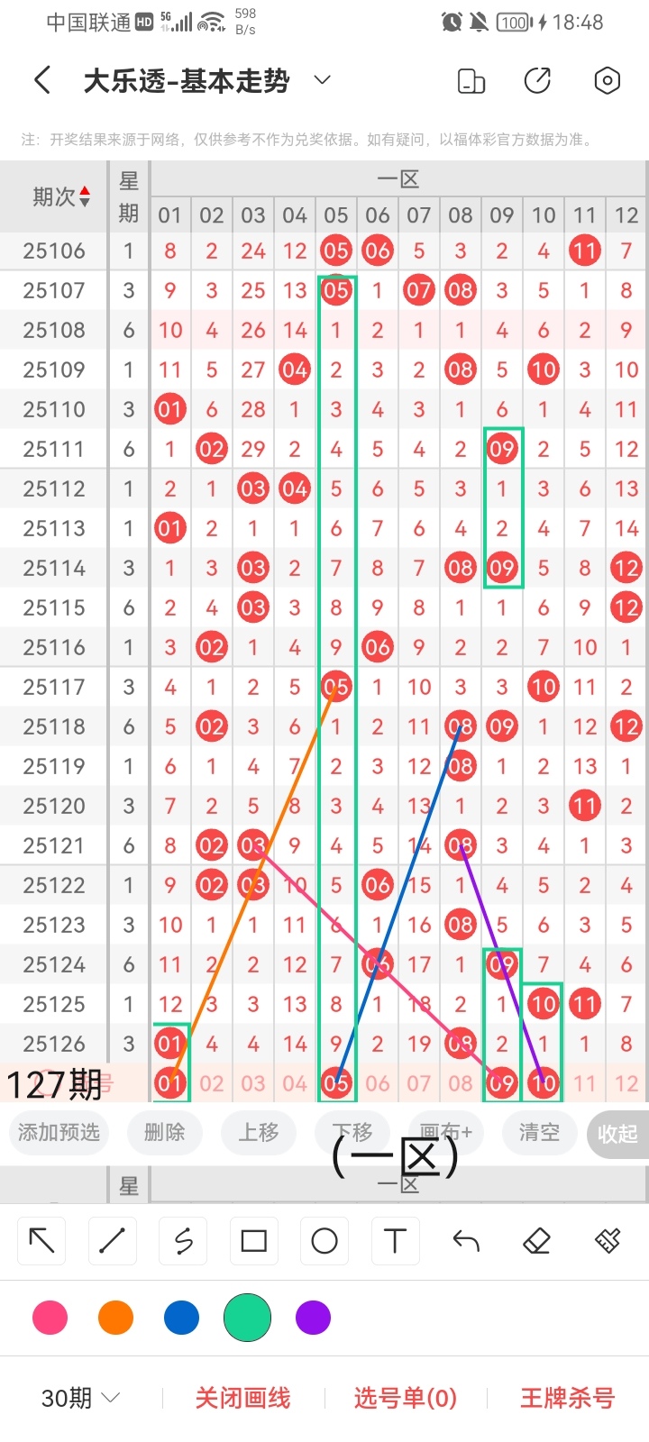 通过以上对上期的简单回顾,下面进入大乐透第2025127期(下面简称本期)的选号分析: