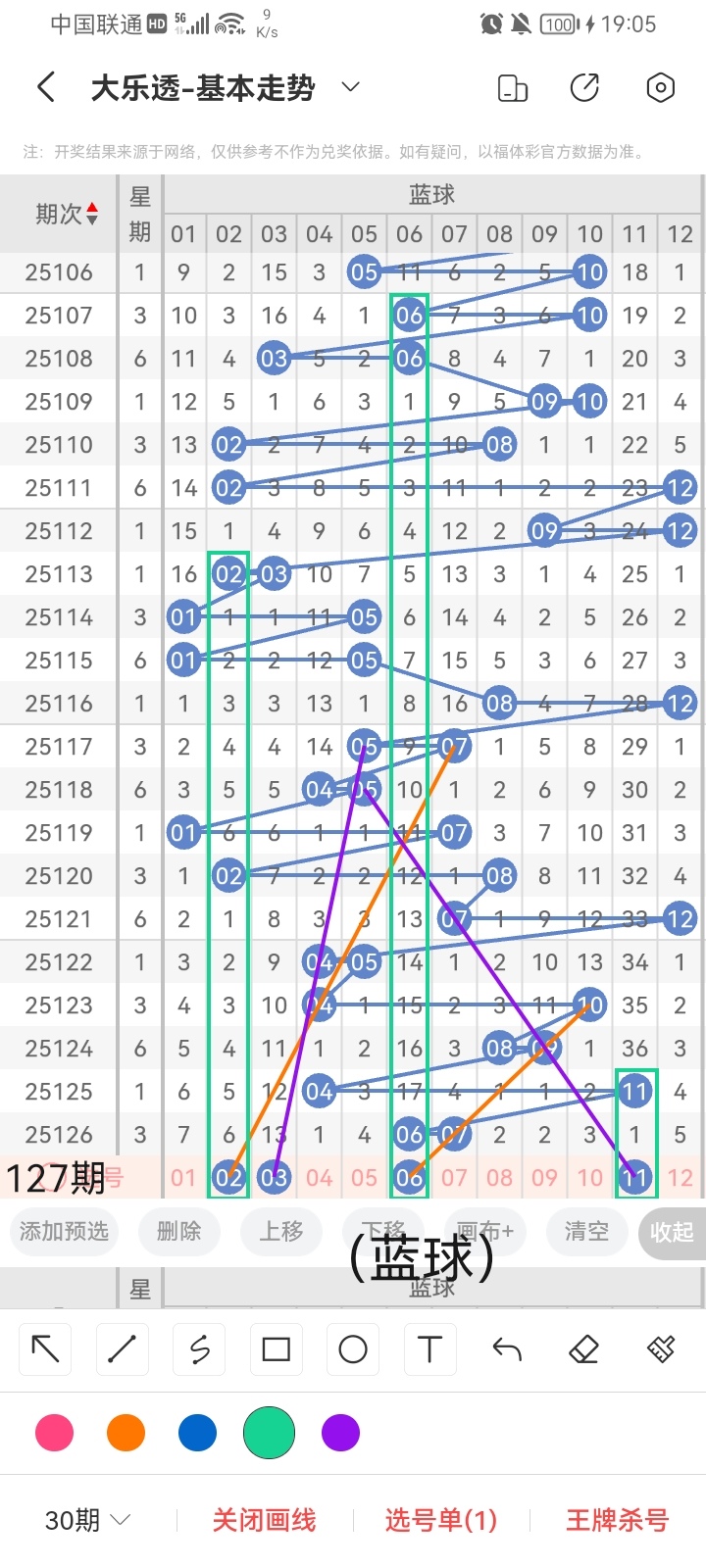 小梁根据图中画线思路,最后给大家汇总提供一下大乐透本期红球、蓝球数据,供大家参考:
