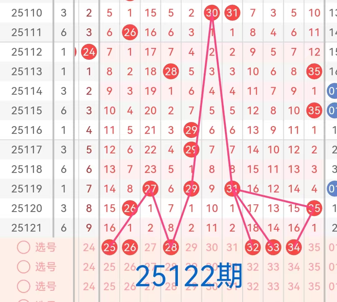 2. 凤尾号码分析:凤尾号码(前区最大号码)上期是21。这是一个小的凤尾,过去十期内,凤尾号码多集中在18到35之间,其中3字头号码表现较为活跃。因此,本期应重点关注18-35区间的数字,特别是号码25、28、33、34
