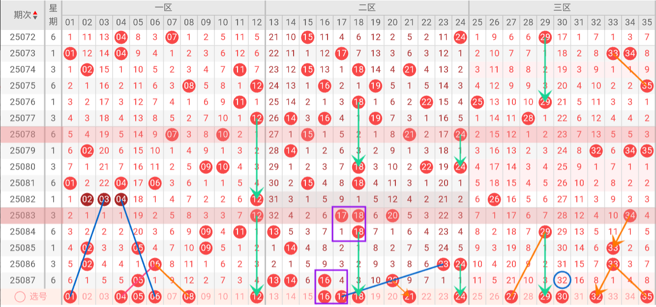 三区(25-35)分析:上期该区没有开出号码,近10期占比16%,与上期相比-2%。本期无三斜连号趋势,无隔码斜连走势。连续5期稳定出1个后上期断区,断区后通常会有回补,而且连续6期出号不足2码,积压了反弹动能。上期断区后反弹概率>90%,历史断区后次期出号≥2枚概率85%。本期将会回暖,出号1-2码。综合考虑,推荐1码,同时低温设防回补2码的可能性。推荐关注号码:27、29、30、32、35。