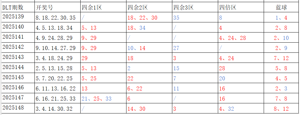 分享第一个数据分析:四分区统计数据。相对于传统的三分区,个人习惯使用四分区,就是把35个红球号码除以4,所得的余数分区如下: