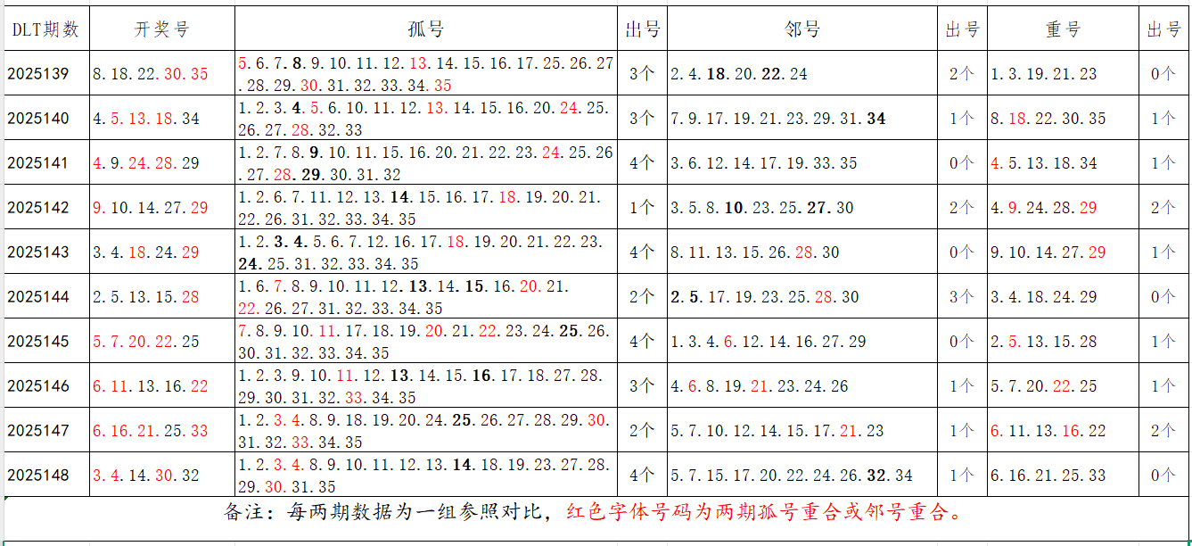 如图,以近两期数据为一组,进行对比分析,相同的孤号、邻号可能在下期开出。本期参考孤号:1.6.7.8.9.10.11.12.16.17.18.19.20.21.22.23.24.25.26.27.28.34.35;邻号:2.5.13.15.29.31.33。重点关注:孤邻号重合号码:***(会员专区可见)。个人分析,仅供参考。