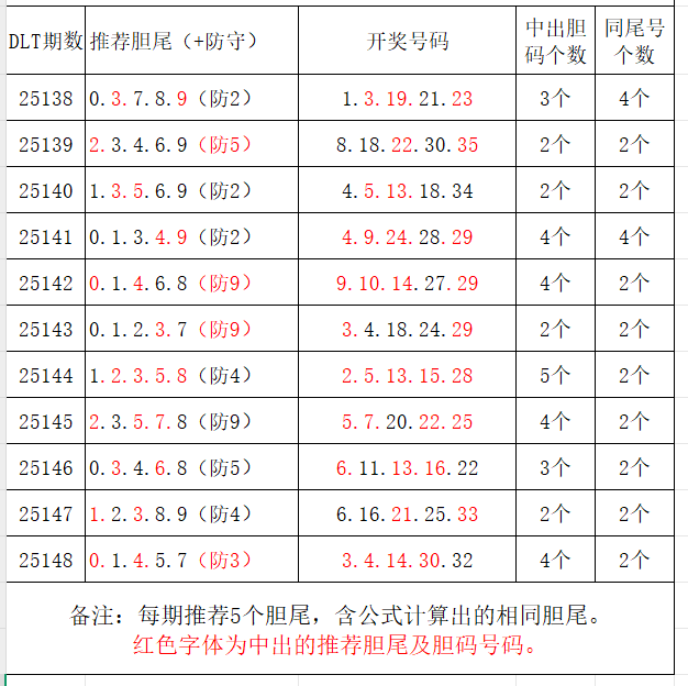 如图,每期推荐胆尾中出1-4个。上期推荐胆尾中出3尾4码!推荐胆尾是按照公式计算的顺序,不定位红球号码的顺序。本期推荐胆尾:2尾/0尾/1尾/6尾/7尾,加推防守胆尾+胆码号码:***(会员专区可见)。个人分析,仅供参考。