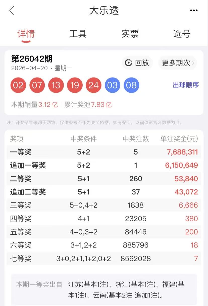 前区奖号开出0个重号,连号开出0个,奇偶比为3:2,跨度为22,三个区间比为2:3:0,后区开出0个重号。