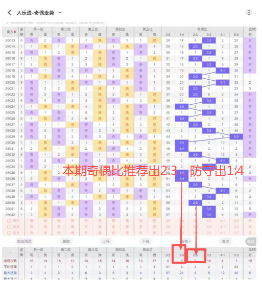 4、奇偶比:上期开出3个奇数,出2个偶数,奇偶比为3:2,整体看偶数强势,本期关注偶数出号,本期推荐出2:3,1:4。