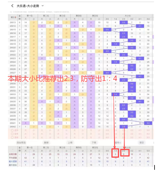 5、大小比:上期开出大小比为2:3,近122期开出4:2出现25次,3:2出现55次,2:3出现5,4次,1:4出现31次,5:0出现4次,本期推荐出2:4,防守出1:4。