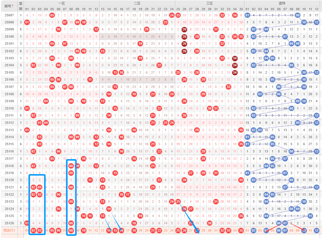 先回顾上期特征:奇偶比23,区间比是212,质合比为140个红球重号,0组连号,1个邻号,4个孤号,蓝球小大组合,奇数组合。