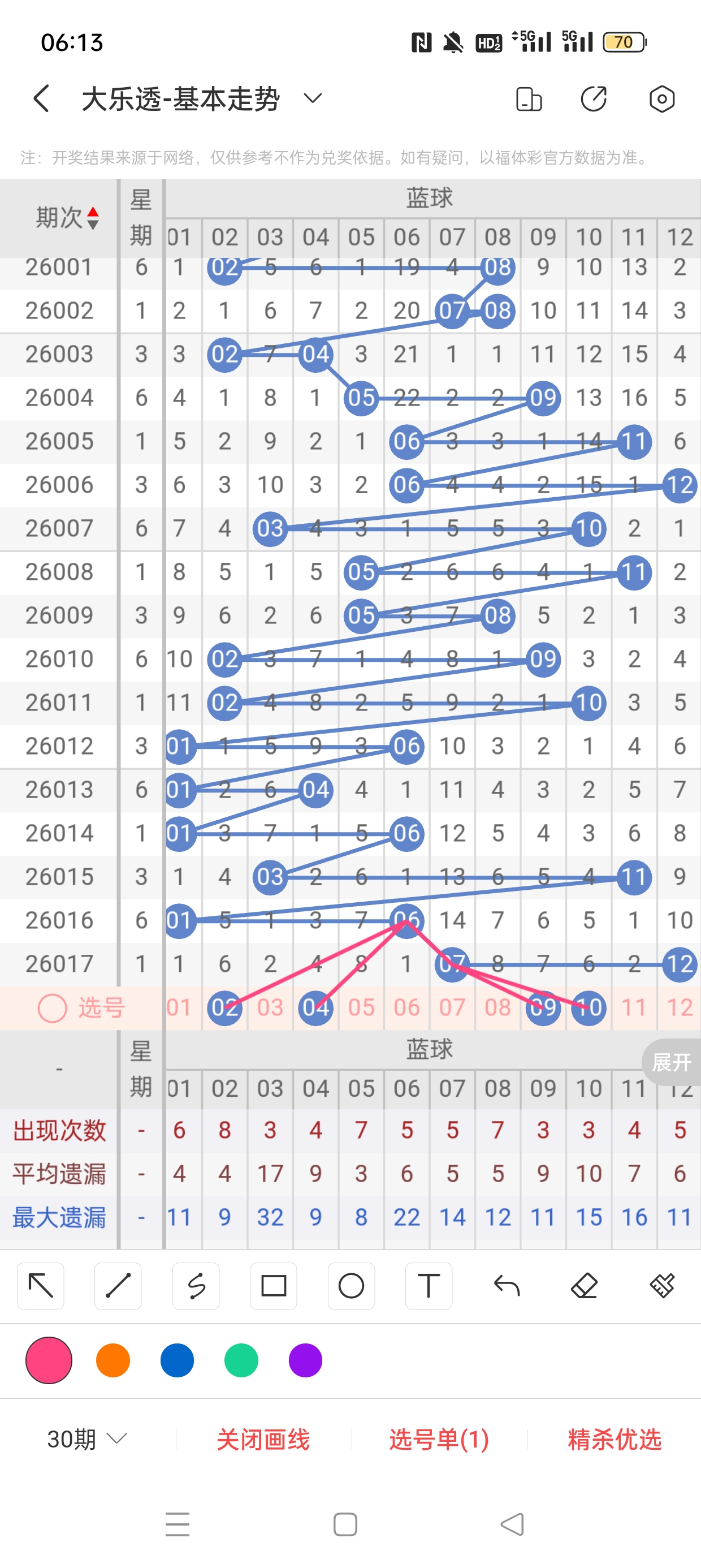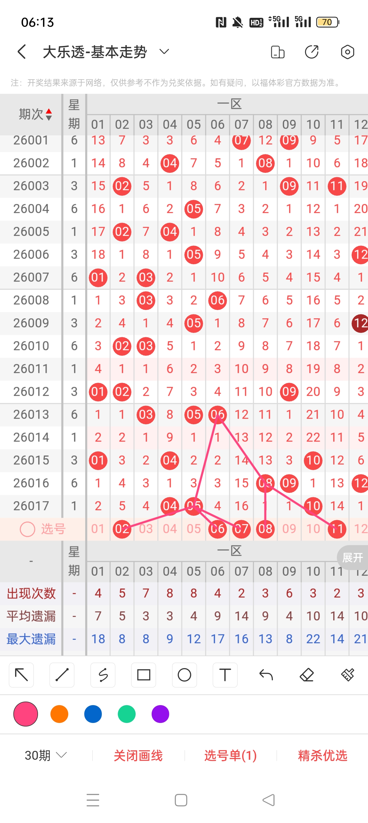 近5期第六位号码012路对比:1:1:0:1:1,1路热度高,本期着重0/2路。邻孤传对比:1邻4孤0传,孤号热度高,本期着重邻传。