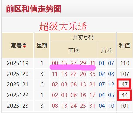 近五期大乐透开奖号码前区和值依次为110→107→47→44→101。前区和值均值为82。前区和值振幅为66,前区和值修正振幅为53。基于动态平衡干预以及波动趋势衡量,本期前区和值推测区间为29-135。基于风险对冲策略,本期前区和值区间缩水为44-116。基于前区和值分析,本期前区质数数量倾向于1-3枚。
