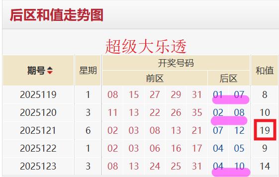 近五期大乐透开奖号码后区和值依次为8→10→19→9→14。后区和值均值为12。后区和值振幅为11,后区和值修正振幅为9。基于动态平衡干预以及波动趋势衡量,本期后区和值推测区间为3-21。基于风险对冲策略,本期后区和值区间缩水为8-18。