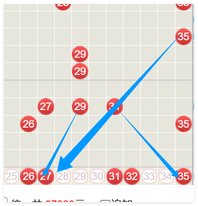 接下来我们重点看一下三分区。三分区25~35这个大号区间上期的话没有号码产生,那么本期我们主要的话还是要防一下会产生1~2个号码。重点是关注这个26号27以及31和35