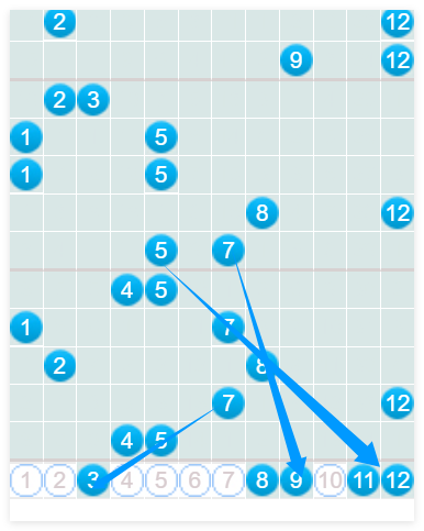 那么现在我们对大乐透一分区01~12号进行分析。上期一分区开出了020306组合号码,那么关键点就在于08往左的形态走了一个跨度为2的一个06。所以说把这个0203呢,它是要重复的。那么本期的话,我们一分区重点的话,还是要看一下这个零字头的134是否会有一个号码产生。那么,如果是只有一个的话,大家主要关注03或者04,其次的话,11.12号是大家要重点关注的一个定点位方向。