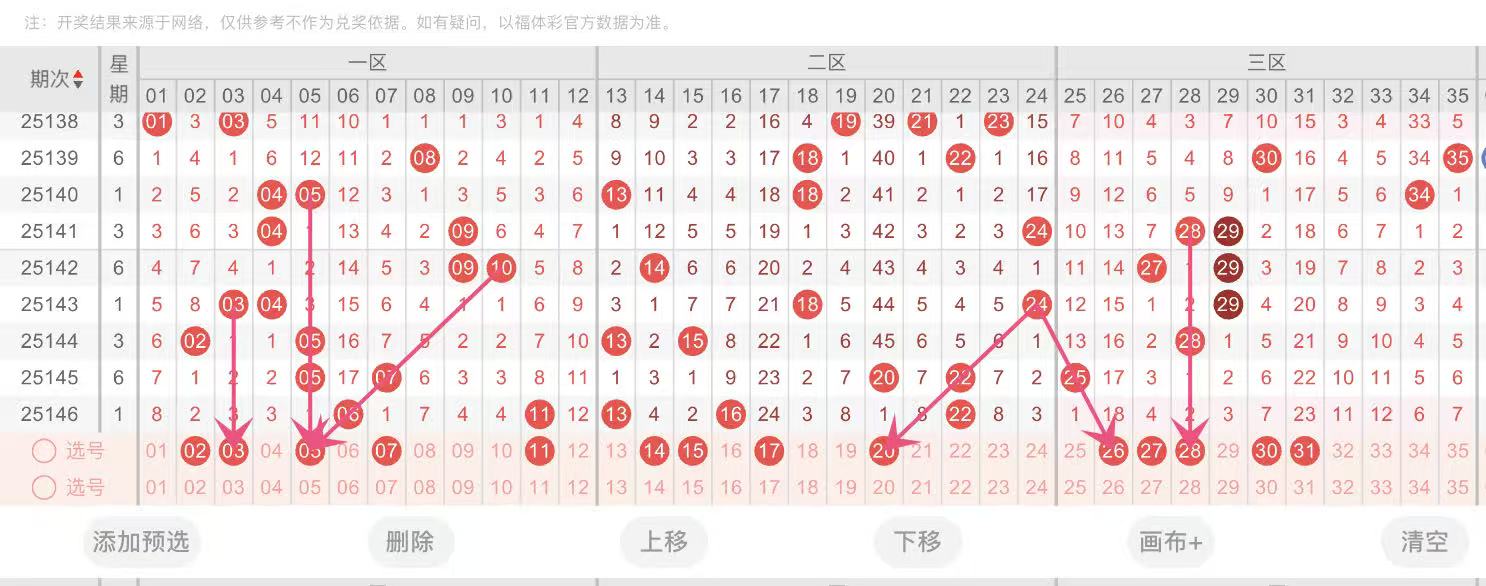 上期开奖:大乐透第 2025146 期开出奖号: 06,11,13,16,22 +02,03 其中红球号码大小比为 1:4,奇偶比为 2:3,区间比为 2:3:0 , 012 路 比 1:3:1,和值为 68,跨度为 16,蓝球开出 2 路转 0 路。