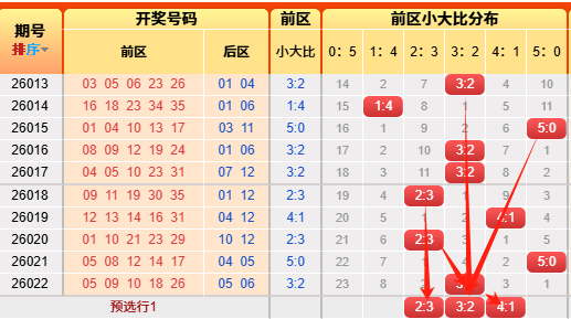 上期前区小大比3:2,命中。言归正传我们继续用历史数据说话,前区小大比分成6051423324150(如图),我统计了一下历史出现次数,05出现107次、14出现517次、23出现981次、32出现823次、41出现356次,50出现56次,再看近10期小大比出现次数比为012412,通过历史数据对比观察以及根据遗漏对称理论原则,故本期我们选择4:1、2:3、3:2(具体精准方向请查看小车小大比精选)