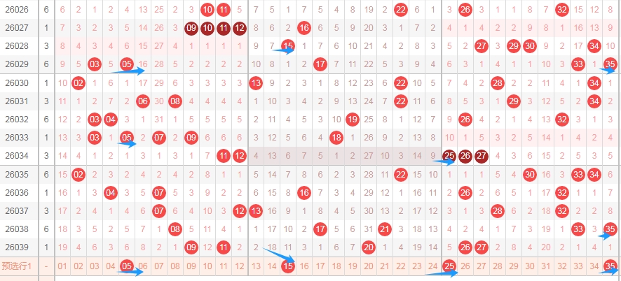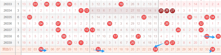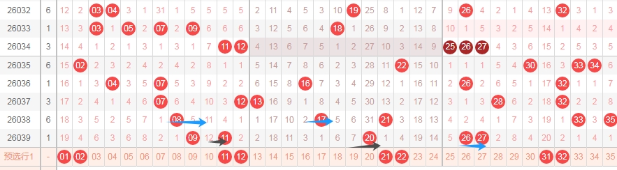 上图是体彩大乐透前区开奖号码走势分布图,我标注出来的蓝色箭头看看都是跨度二的走势,上期开出了数字26,那么本期可以考虑一下4尾数的数字04 14 24 34出一个或者两个吧。因为上期开出了21后一期就出现了09,那么上期开出了数字26,那么本期也可以考虑一下4尾数的数字出号码。