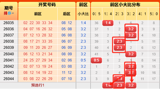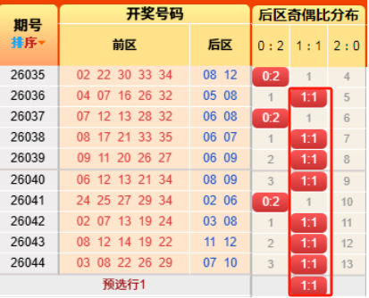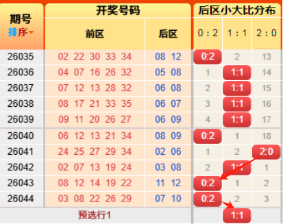 上期后区开出小大比为0:2,连续推测正确。