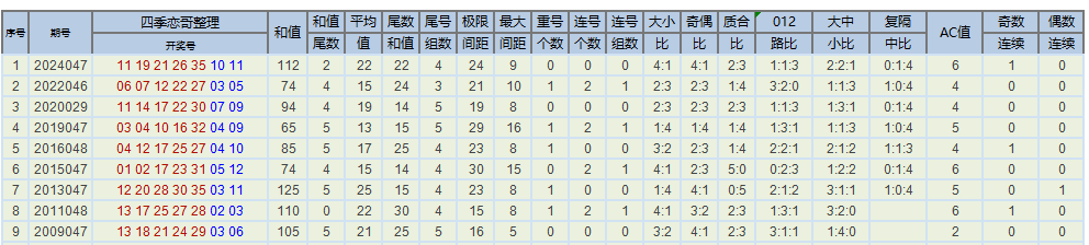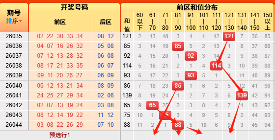 上期开出和值88。本次我们先根据历史次数统计,和值60以下开出256次、61-70开出241次、71-80开出377次,81-90开出493次、91-100开出505次,101-110开出386次、111-120开出316次、121-130开出157次、131-140开出91次、141-150开出27次、150以上开出9次,再来看近十次以上和值分别开出了0次、1次、1次、3次、2次、0次、1次、1次、1次、0次、0 ,低于阈值的有60区间以下、61-70区间、81-90区间、91-100区间、101-110区间、121-130区间,再根据遗漏斜率对称理论,本期注意61-70区间、81-90区间、101-110区间、121-130区间。