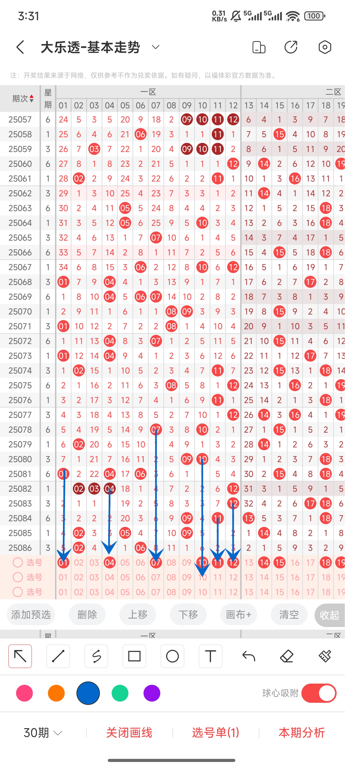 上一期开出的数字为02和06。往前一期开出的是02,05和09。其中02已经连续开出了两期了,所以本期我们不考虑连出,因为06也不是一个特别热门的号码,所以也不考虑连出。通过分析一区走势图,本期我们可以关注一些最近没有开出的热号和一些比较久没有开出的温码。所以我们可以关注01,04,07,10,11,12等号码。综上所述本期我们推测01,04,07,10,11,12号球可能会开出。