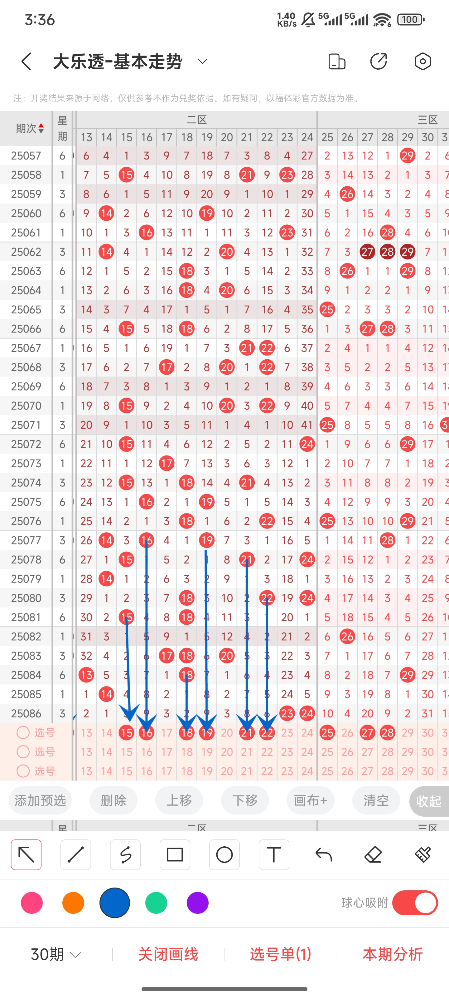 上一期开出了23,24。往前一期开出14。因为23和24不是什么大热门的号码,所以本期我们也不考虑连出。通过分析走势图,二区开出的号码都比较均匀,基本上都是轮流开一遍。那么我们就可以结合冷热号和遗漏期数关注一些号码,例如15,16,18,19,21,22。这其中有比较热门的号码,也有遗漏得比较久的冷号。综上所述我们可以推测本期可能会开出15,16,18,19,21,22等号码。