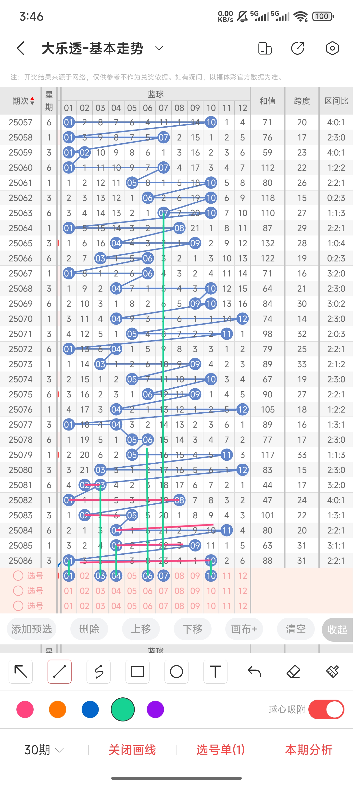上期开出的01和10。往前一期开出04和09,。因为01和10都是比较热门的号码,所以本期我们可以继续考虑连出的可能性。通过分析蓝区走势图,我们可以看到蓝区开出的号码跨度基本遵循一大一小这样子开。因为上期开出的是大跨度,那么本期跨度可能会变小,所以我们可以关注一下中间的热码和遗漏比较久的冷码,例如03,04,06和07。所以本期我们推测可能开出01,03,04,06,07,10等号码。