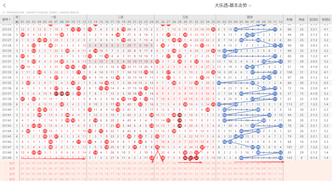 上期开奖号码为:24 26 30 31 32 +05 12区间比014 和值143  跨度8  奇偶比1:4