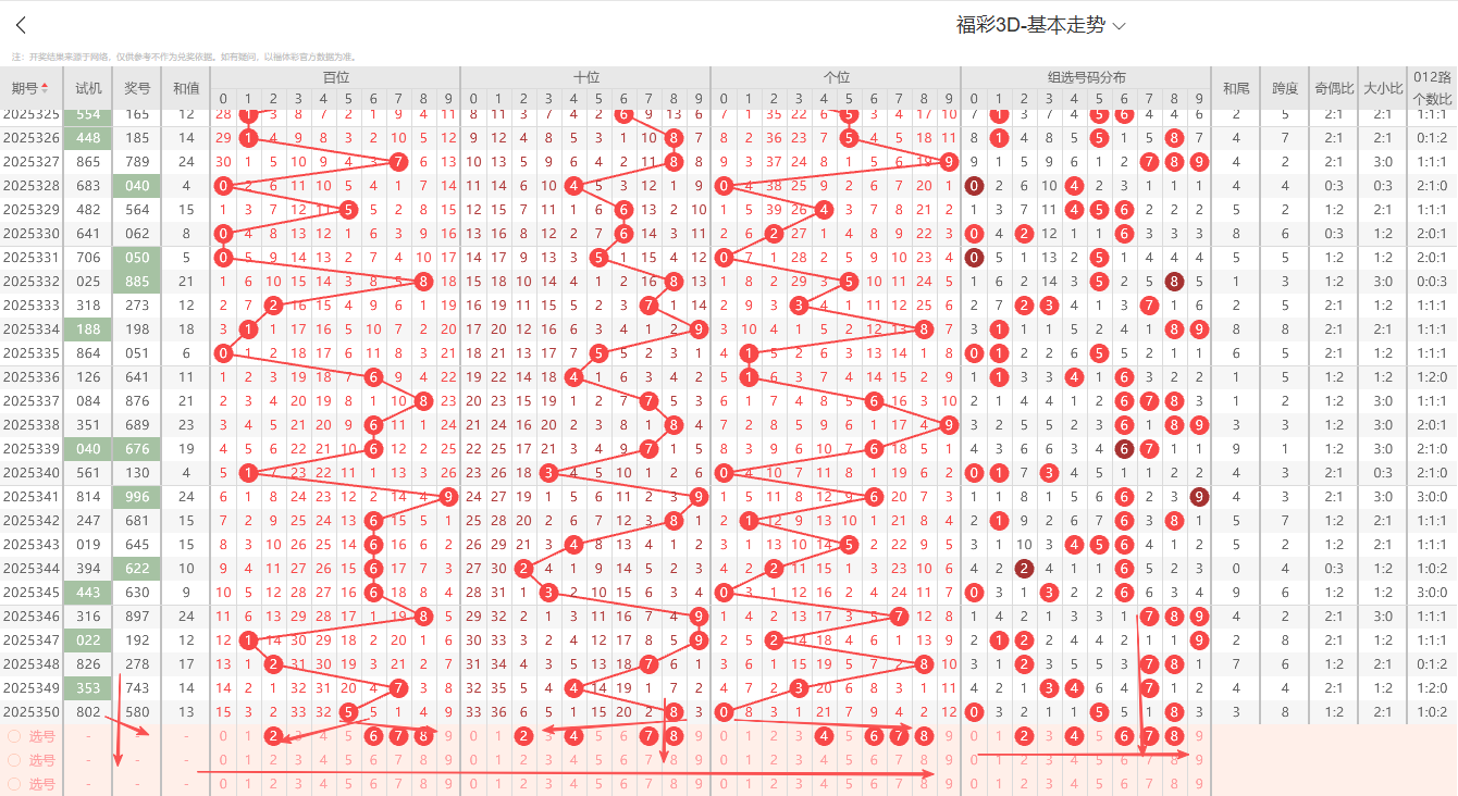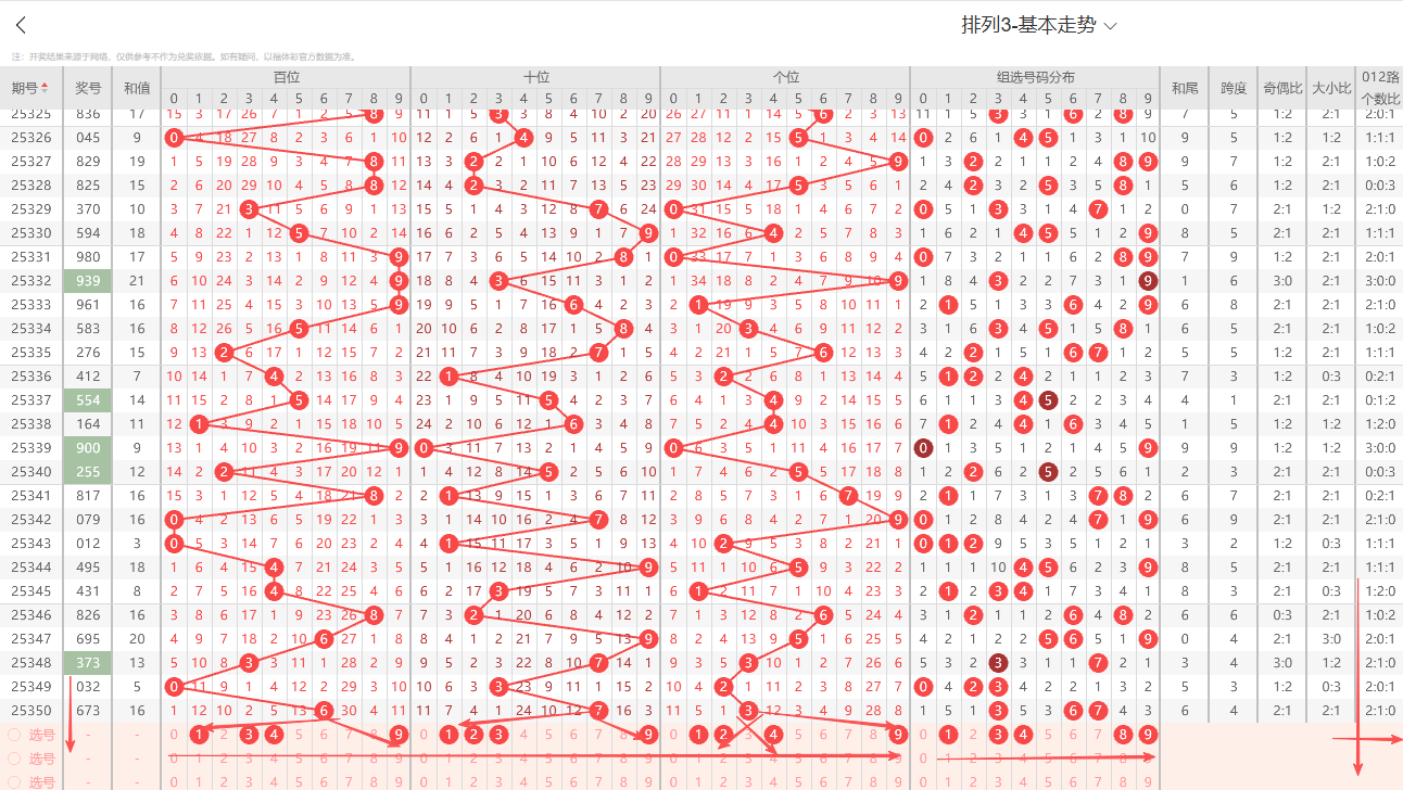 ①百位:上期开出大号偶数6号,在历史开奖记录中显示一般正常的奇偶周期平均在1~3期为普遍现象,偶数连续开出2期上期为0路号码依据奇偶以及012路周期性规律的转变特征点即本期1路号码有开出的趋势0路号码注意预防