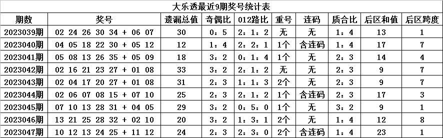 后区和值:上期后区和值开出23,和值上升11个点位,近9期和值分别开出:13、17、14、9、9、17、9、12、23,本期看好和值下降,在10周围出现。