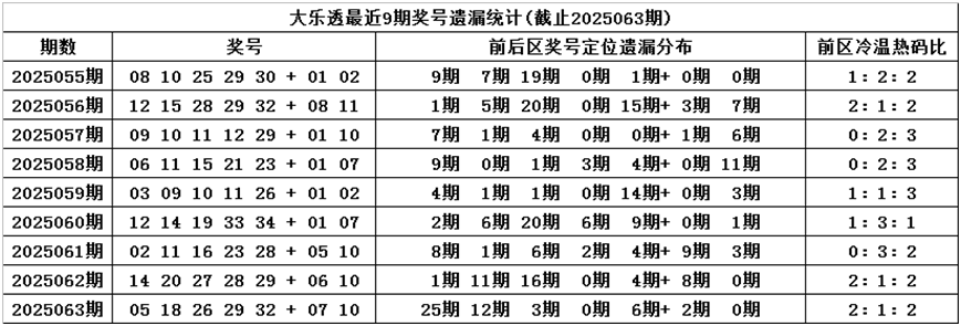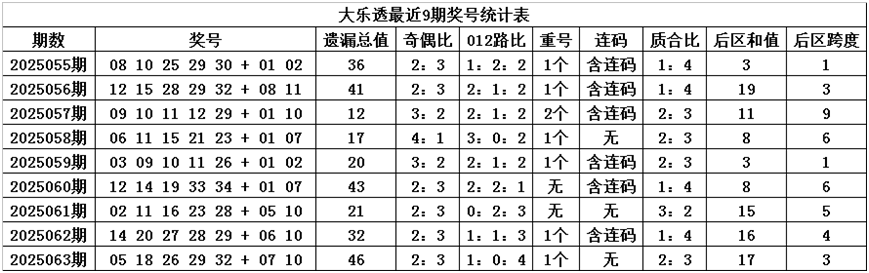 体彩大乐透第2025063期奖号为:05 18 26 29 32 + 07 10,各位号码遗漏期数分别为:25期、12期、3期、0期、6期+2期、0期,前区号码遗漏总期数为46期,012路比为1:0:4,奇偶比为2:3,包含1个重复号码:29。后区号码遗漏总期数为2期,和值为17,跨度为3。