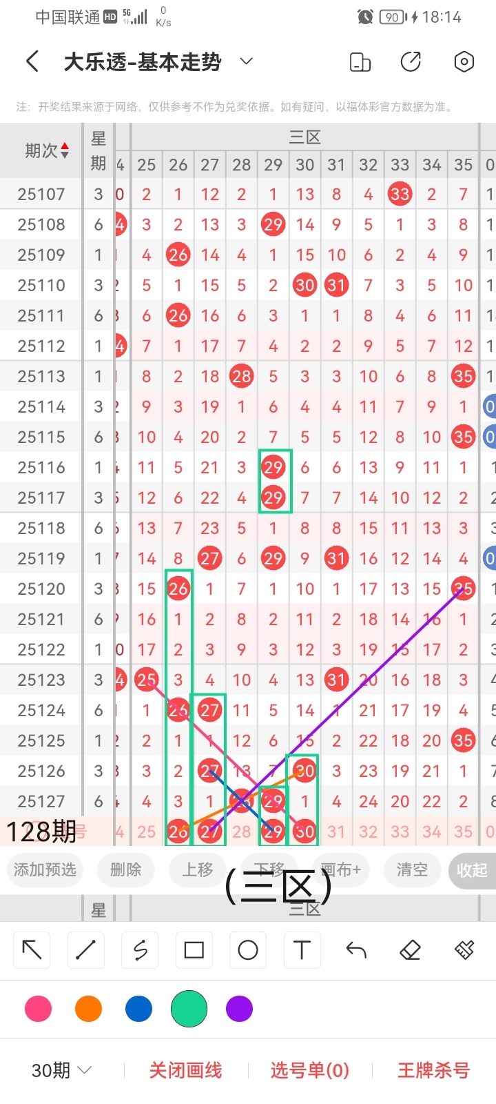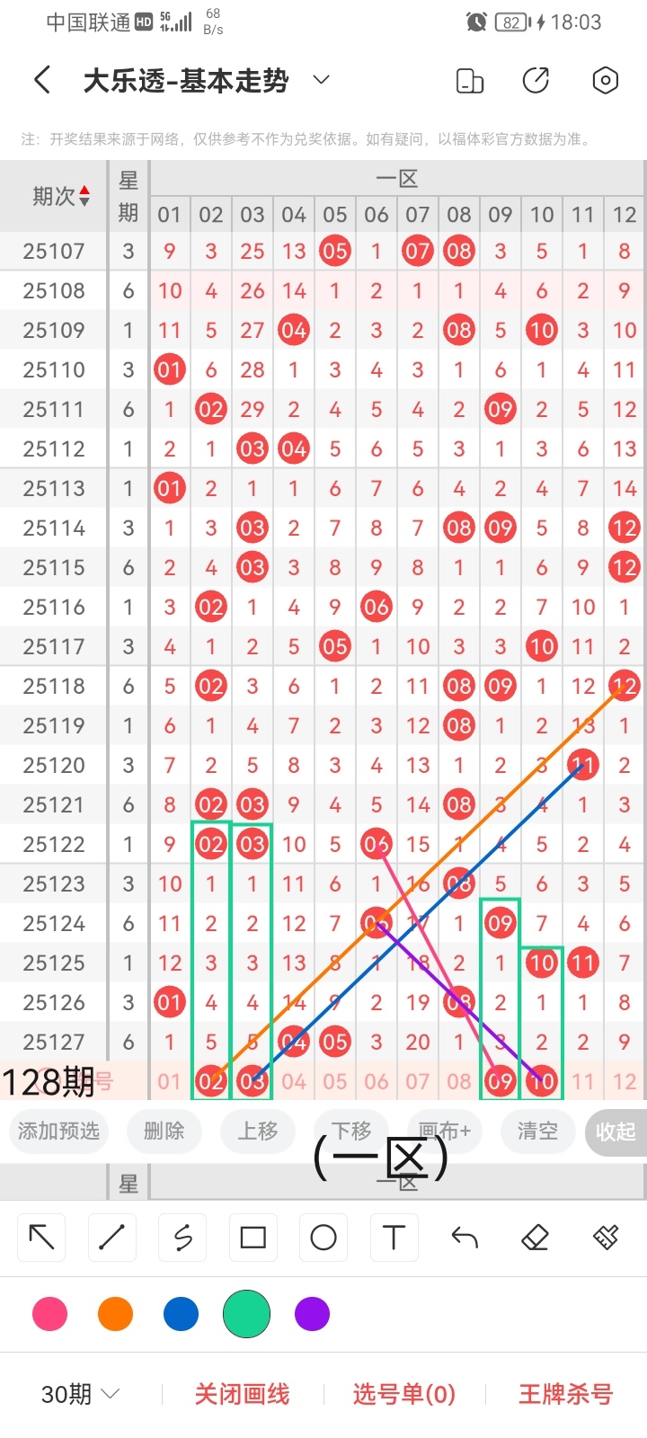 通过以上对上期的简单回顾,下面进入大乐透第2025128期(下面简称本期)的选号分析: