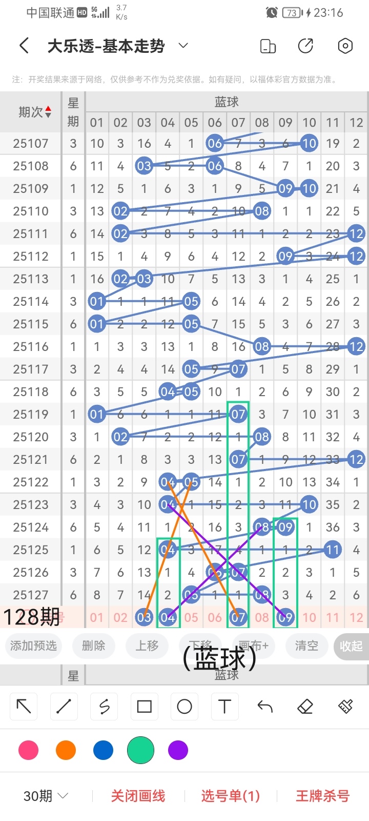 小梁根据图中画线思路,最后给大家汇总提供一下大乐透本期红球、蓝球数据,供大家参考: