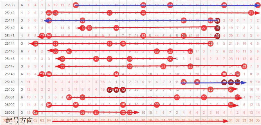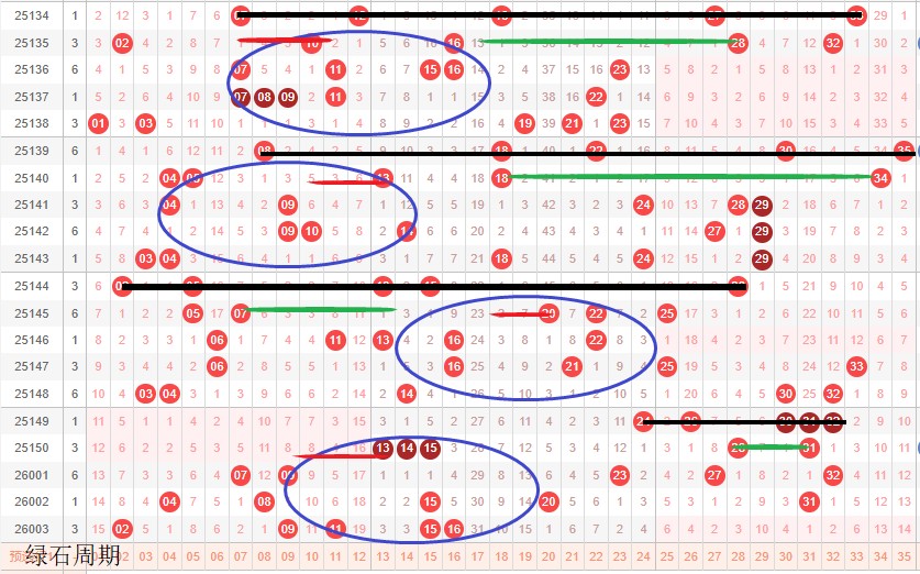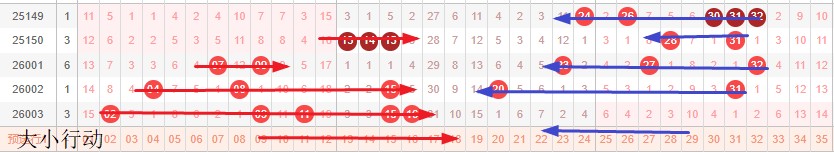 如图所示:体现的是3个局部走势的发展周期,圆圈为密集处的填空,本期定性为新局部走势第1期,画线期,造成号码密集,主动调整空间,上期全小号,本期16-35填2-3枚,小号多开。