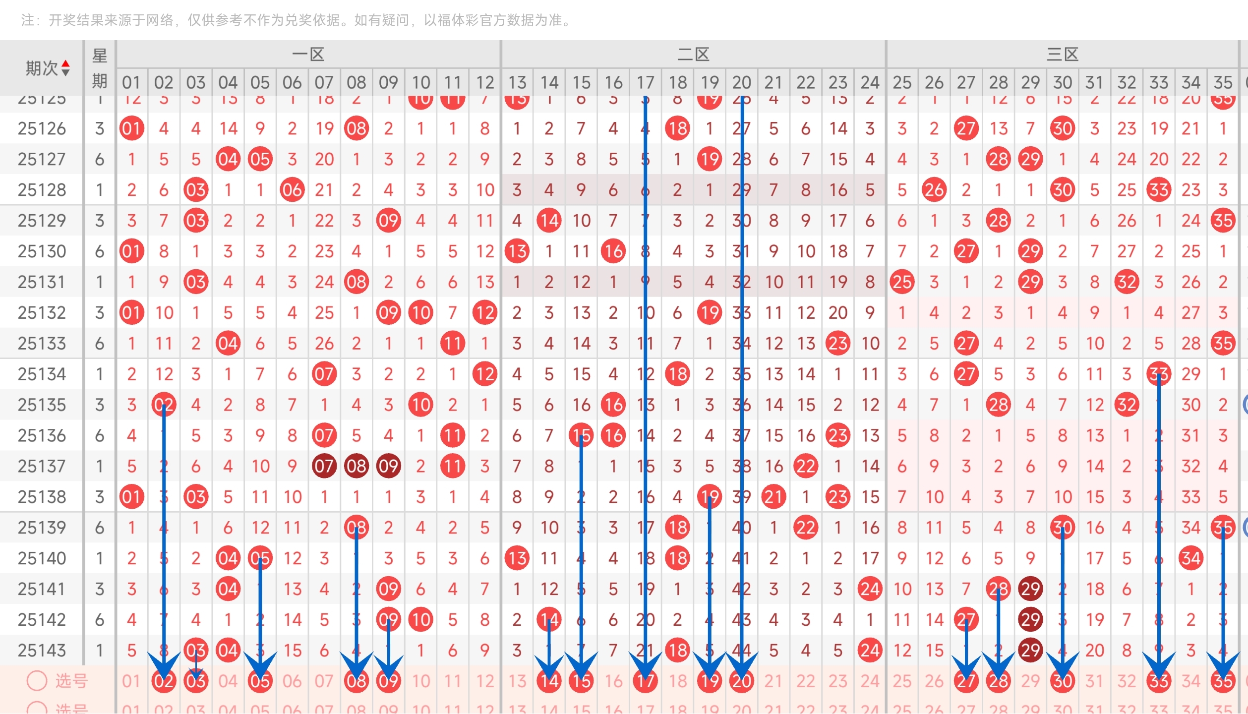 上期开出了29号球,往前一期开出了2729号球。通过分析走势图,可以看到上期凤尾还是开了中间的位置,而且是连续开了329号球,推测本期大概率不会继续开出,本期凤尾比看好回补右边,其余号码的话,比较看好左边的号码。最后再结合冷热号和遗漏期数,本期我们可以关注2728303335等号。综上所述本期三区我们推测可能会开2728303335等号码。