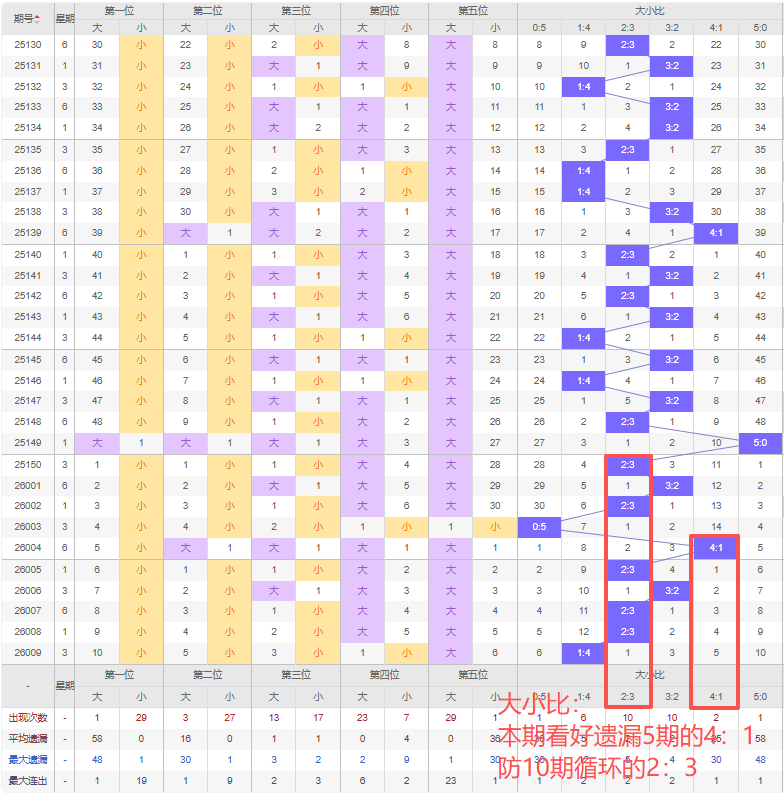 上期大小比:1:4,近10期大小比出现情况:2:3、3:2、2:3、0:5、4:1、2:3、3:2、2:3、2:3、1:4,最近10期出现2期3:2,出现5期2:3,出现1期4:1,出现1期1:4,出现0期5:0,出现1期0:5,根据近10期规律本期看好遗漏5期的4:1,防10期循环出2:3,综上所述推荐大小比推荐:2:3,重点关注:4:1。