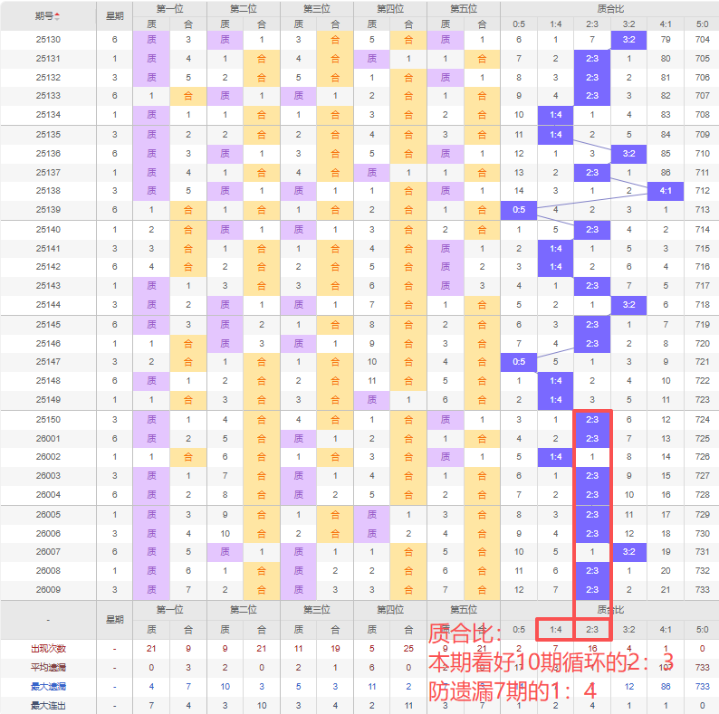 上期质合比:2:3,近10期质合比出现情况:2:3、2:3、1:4、2:3、2:3、2:3、2:3、3:2、2:3、2:3,最近10期出现1期3:2,出现8期2:3,出现0期4:1,出现1期1:4,出现0期5:0,出现0期0:5,根据近10期规律本期看好10期循环出2:3,防遗漏7期的1:4,综上所述推荐质合比推荐:1:4,重点关注:2:3。
