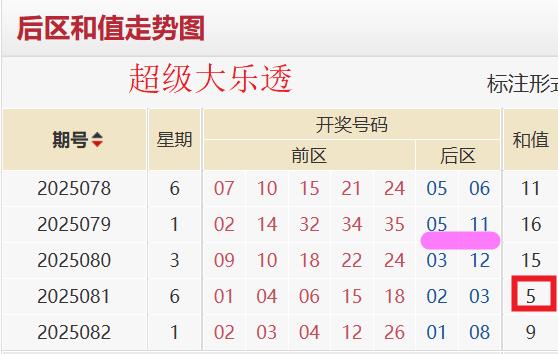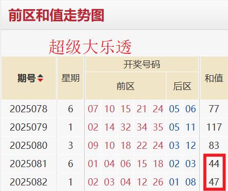 近五期大乐透开奖号码前区和值依次为77→117→83→44→47。前区和值均值为74。前区和值振幅为73,前区和值修正振幅为58。基于动态平衡干预以及波动趋势衡量,本期前区和值推测区间为16-132。基于风险对冲策略,本期前区和值区间缩水为44-104。基于前区和值分析,本期前区质数数量倾向于1-2枚。