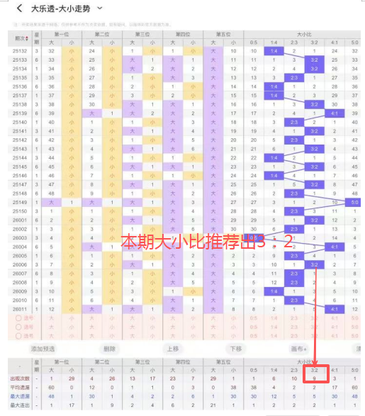 5、大小比:上期开出大小比为4:1,近106期开出4:1出现23次。3:2出现46次,2:3出现46次,1:4出现29次,5:0出现4次,本期推荐出3:2.。