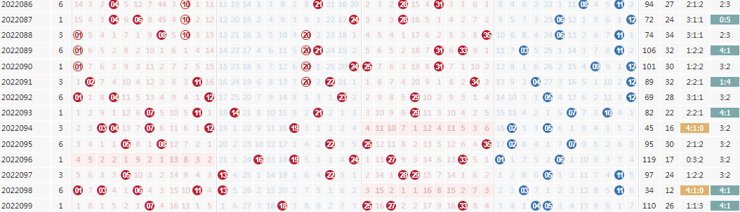 上期开出1个温码:07,温码走势一般,近9期温码开出频次较高,目前前区有11个温码:02、04、08、12、14、20、21、23、31、34、35,本期防止温码逐渐转冷,看好全部轮空。