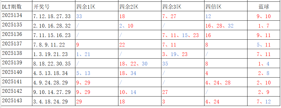 分享第一个数据分析:四分区统计数据。相对于传统的三分区,个人习惯使用四分区,就是把35个红球号码除以4,所得的余数分区如下: