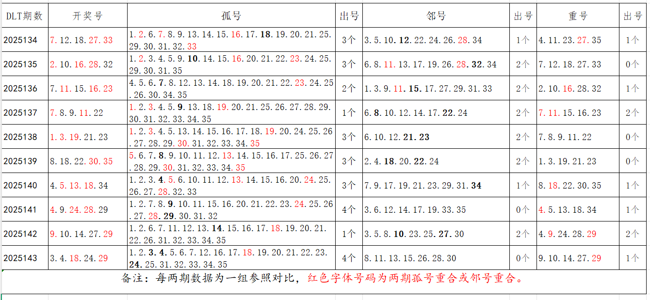 如图,以近两期数据为一组,进行对比分析,相同的孤号、邻号可能在下期开出。本期参考孤号:1.6.7.8.9.10.11.12.13.14.15.16.20.21.22.26.27.31.32.33.34.35;邻号:2.5.17.19.23.25.28.30。重点关注:孤邻号重合号码:***(会员专区可见)。个人分析,仅供参考。