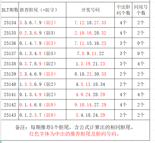 分享第三个数据分析:依据推荐的胆尾,推定胆码号码。每期计算出5个胆尾,做为推荐胆尾。以近10期推荐胆尾的统计数据为例: