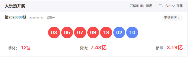 开奖号码:03 05 07 09 18- 02 10