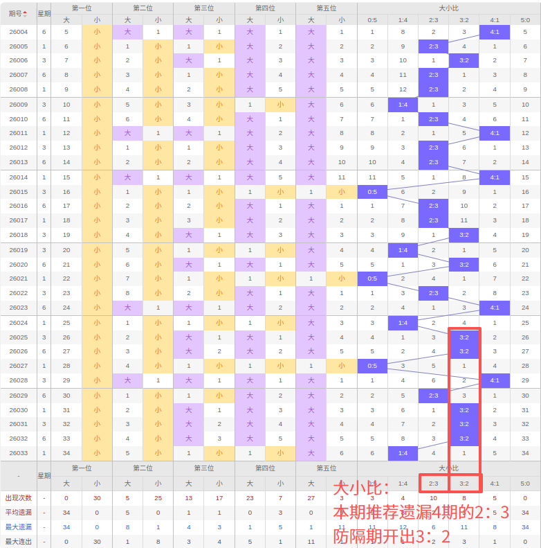 上期大小比:1:4,近10期大小比出现情况:1:4、3:2、3:2、0:5、4:1、2:3、3:2、3:2、3:2、1:4,最近10期出现5期3:2,出现1期2:3,出现2期4:1,出现1期1:4,出现0期5:0,出现1期0:5,根据近10期规律本期看好遗漏4期出2:3,防隔期出3:2,综上所述推荐大小比推荐:3:2,重点关注:2:3。