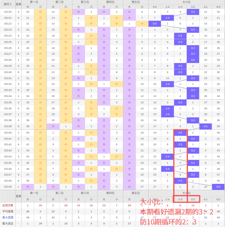 上期大小比:5:0,近10期大小比出现情况:2:3、3:2、2:3、3:2、1:4、3:2、1:4、3:2、2:3、5:0,最近10期出现4期3:2,出现3期2:3,出现0期4:1,出现2期1:4,出现1期5:0,出现0期0:5,根据近10期规律本期看好遗漏2期的3:2,防10期循环开出2:3,综上所述推荐大小比推荐:2:3,重点关注:3:2。