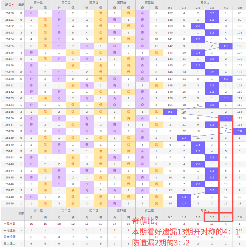 上期奇偶比:1:4,近10期奇偶比出现情况:2:3、2:3、3:2、2:3、3:2、3:2、2:3、3:2、1:4、1:4,最近10期出现4期3:2,出现4期2:3,出现0期4:1,出现2期1:4,出现0期5:0,出现0期0:5,根据近10期规律本期看好遗漏13期出4:1,防遗漏2期出3:2,综上所述推荐奇偶比推荐:3:2,重点关注:4:1。
