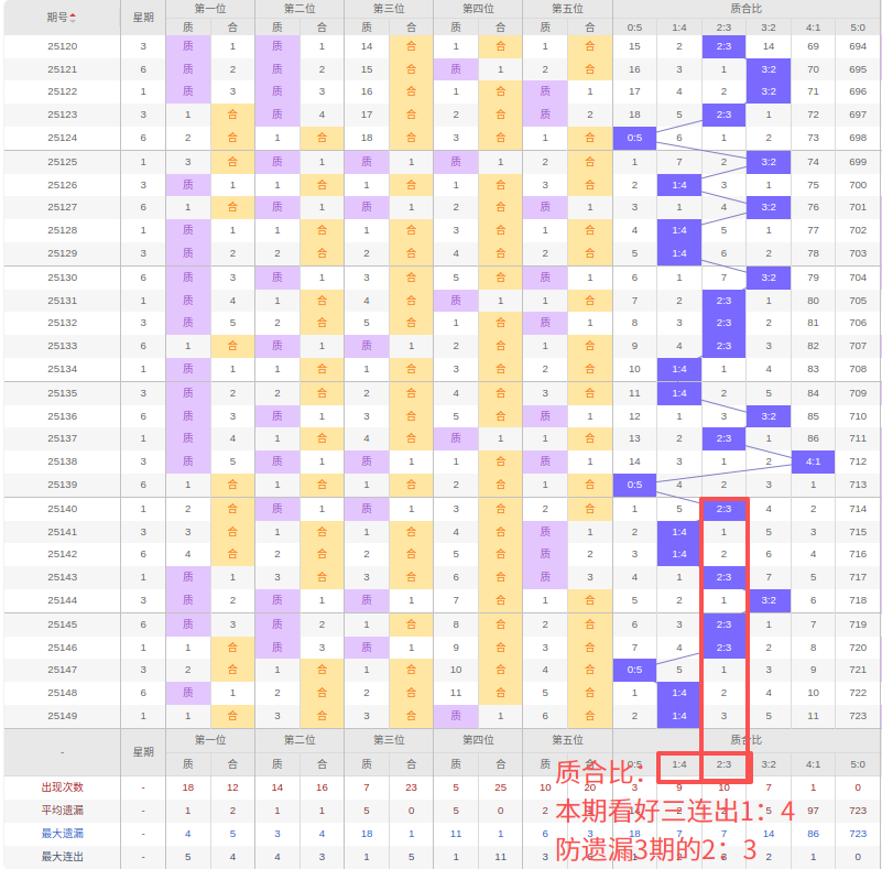 上期质合比:1:4,近10期质合比出现情况::3、1:4、1:4、2:3、3:2、2:3、2:3、0:5、1:4、1:4,最近10期出现1期3:2,出现4期2:3,出现0期4:1,出现4期1:4,出现0期5:0,出现1期0:5,根据近10期规律本期看好三连出1:4,防遗漏3期出2:3,综上所述推荐质合比推荐:2:3,重点关注:1:4。