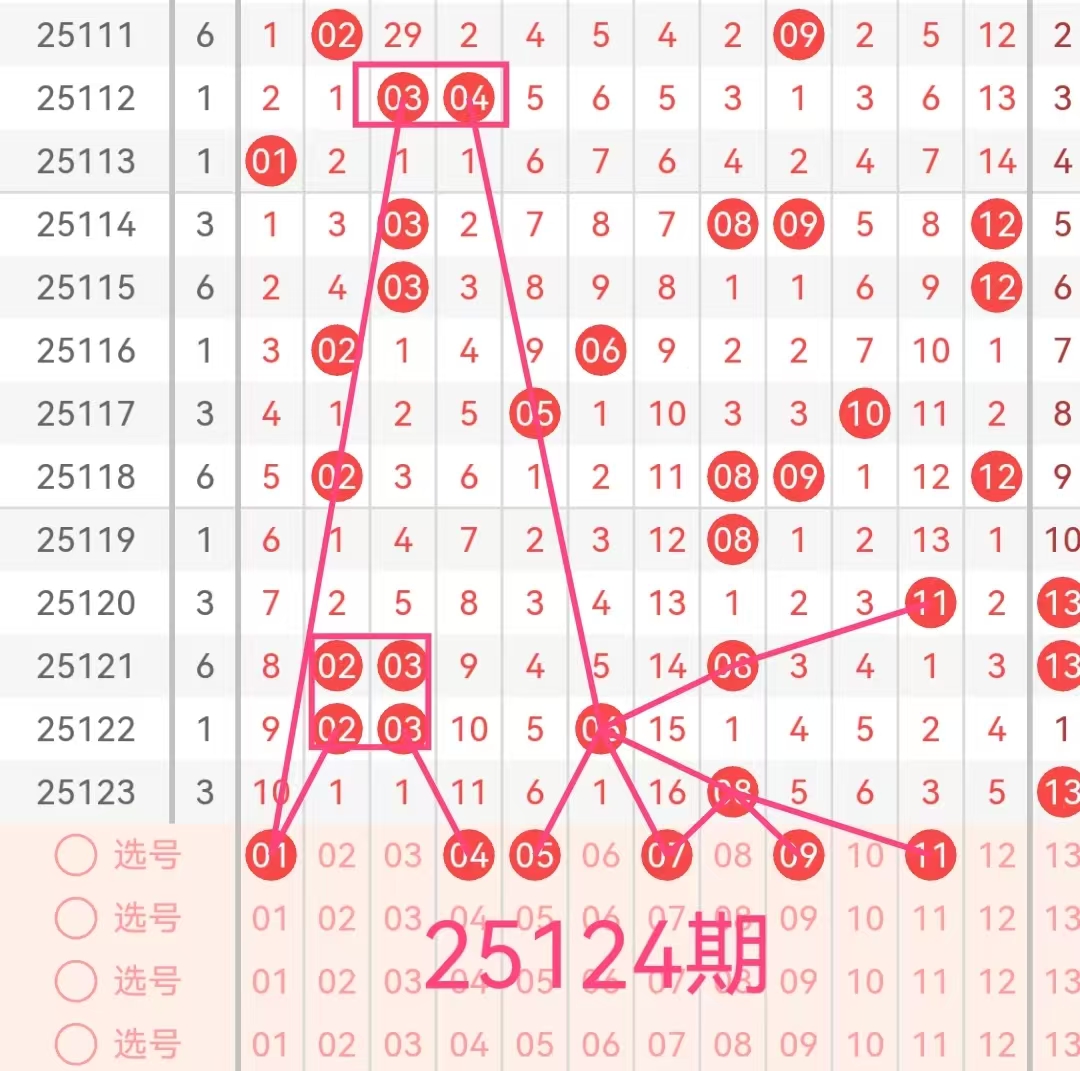 上期大乐透前区奖号开出08 13 24 25 31+04 10。前区的奇偶比为3:2,大小比为3:2,三区比为1:2:2,012路比为1:3:1,和值为101,跨度为23。后区则为一小一大的组合,这些数据为我们接下来的分析提供了基础。