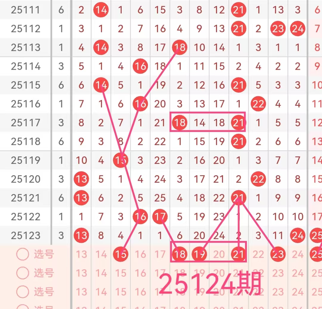 2. 二区(13-24):上期该区间开出两个号码13和24,号码13遗漏1期后开出,号码24在遗漏10期后开出。根据历史开奖来看,近期该区间活跃度较低,本期预计会有1-2个号码会继续开出。特别是那些遗漏次数较大的号码和该区间内近期表现较好的号码,如15、18、19、21、23这几个号码在走势上表现出一定的稳定性,且与前几期出号形成呼应,有望出现在本期开奖中。