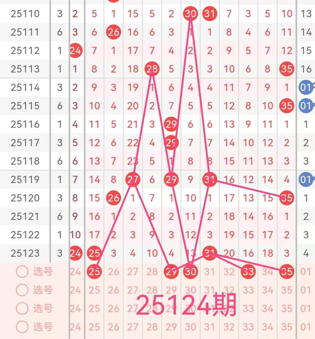 2. 凤尾号码分析:凤尾号码(前区最大号码)上期是31。这是一个小的凤尾,过去十期内,凤尾号码多集中在18到35之间,其中3字头号码表现较为活跃。因此,本期应重点关注18-35区间的数字,特别是号码25、29、30、33