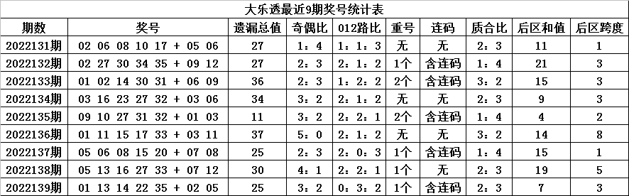 体彩大乐透第2022139期奖号为:01 13 14 22 35 + 02 05,各位号码遗漏期数分别为:2期、0期、5期、12期、6期+20期、7期,前区号码遗漏总期数为25期,012路比为0:3:2,奇偶比为3:2,包含1个重复号码:13。后区号码遗漏总期数为27期,和值为7,跨度为3。