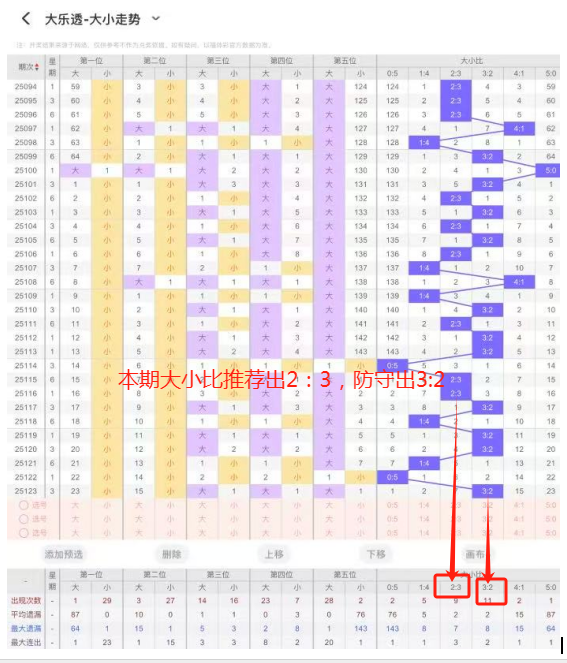 6、大小比:上期开出大小比为3:2,近80期开出4:1出现19次,3:2出现32次,2:3出现42次,1:4出现27次,5:0出现3次,本期推荐出2:3,防守出3:2,本期重点推荐出3:2。